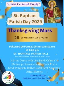 On the eve of the feast of the Archangels, we invite you to join us for a formal Dinner & Dance to celebrate the Jubilee of St. Raphael in the Parish Centre, starting at 6:00pm. Guests are welcome to bring their own wine and beer to enjoy with the included meal. Tickets, $50 per adult, will soon be available for purchase at the back of the church after the weekend masses.