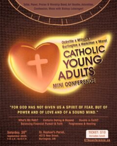 This event is happening on Saturday, September 20, here in St Raph’s. It’s a full-day program featuring talks and panel (with many different religious and lay industry-leading speakers) on topics that are very relevant to young adults: from finding our paths, career, relationships, to inner healing. There will also be many art booths, praise and worship, Adoration, Confession, and a special closing Mass with Bishop Lobsinger.